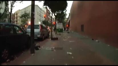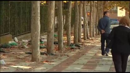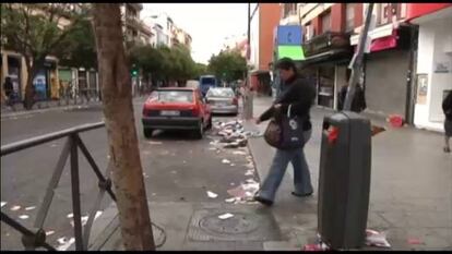 En la calle de Valverde, los niños buscan la parte de la acera más limpia para jugar a la pelota. Según cuenta Inés Higos, vecina de 60 años, unos vándalos trataron de quemar la pasada semana un contenedor, "pero la policía llegó a tiempo". Otra de estas instalaciones luce sin embargo calcinada justo en la esquina de esa calle. Hay papeles y cartones carbonizados además de cristales rotos frente a la fachada del colegio de las Mercedarias de Juan de Alarcón. Las risas de los niños, de unos siete años, llegan desde una de las ventanas. Al salir, sus padres les agarran con firmeza de la mano.