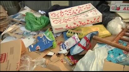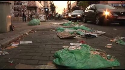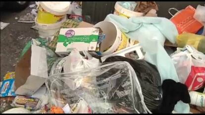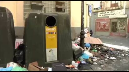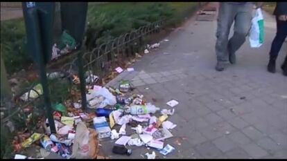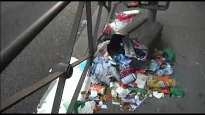 En la Gran Vía, los paseantes siguen su camino sin mirar la basura que jalona las aceras en la arteria principal de la capital. Es como si, tras días y días de parón, los peatones se hubiesen resignado a contemplar la postal de cajas de lechugas podridas, cáscaras de plátanos, cajetillas o colillas que rezuman de las papeleras. O las montañas de cartones, bricks de leche y ropa tirada, que da la bienvenida a los turistas en muchas de las esquina de este céntrico enclave. El sonido del tráfico se ve interrumpido muchas veces por bolsas de plástico que explotan al paso de los coches. Pero ya no pitan.