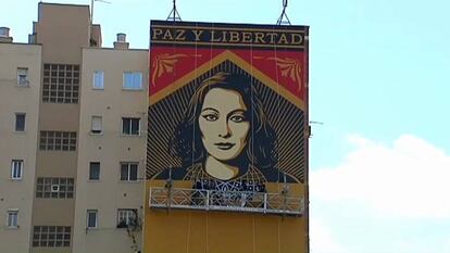 Poco antes de las once de la mañana de este lunes, cuatro individuos colgados de un andamio desafiaban el frío viento que sopla cerca de la desembocadura del río Guadalmedina, a espaldas del Centro de Arte Contemporáneo de Málaga. Se las ven y se las desean para pegar unas láminas en la fachada de un bloque ante la atenta y sorpresiva mirada de varias decenas de alumnos de primaria que juegan en el patio del colegio que queda debajo. Los niños no pierden de vista a esa cuadrilla de pintores que, espray en mano, dan forma a un enorme mural que, bajo el título Paz y libertad, muestra a una bella mujer que rodea con sus manos el símbolo pacifista que marcó la década de los años sesenta del siglo pasado. Quizá no sepan —o quizá sí porque sus profesores les hayan informado— que quien se encarama a esa fachada es uno de los artistas urbanos más reputados del mundo, el estadounidense Frank Shepard Fairey, conocido artísticamente por OBEY.