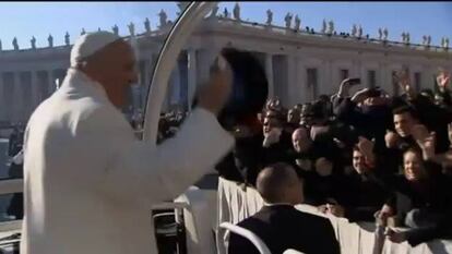 El Club de Amigos de la Boina de Bizkaia ha hecho hoy entrega al papa Francisco de una txapela negra durante la audiencia general del miércoles en la plaza de San Pedro, en el Vaticano. Al paso del papamóvil para saludar a los fieles congregados en la plaza, uno de los integrantes del grupo le ha lanzado la tradicional boina vasca y el pontífice ha estirado el brazo para recogerla. "¿Es para mí?", ha dicho sonriente Francisco al recibir la txapela, quien a continuación, se la ha puesto fugazmente en la cabeza, aunque al revés.