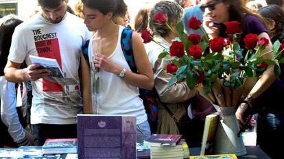 8.00 horas. Las paradas empiezan a estar vestidas con las senyeras. Las cajas de libros empiezan a descargarse en les Rambles. Las grandes librerías ya han instalado los tenderetes en el Paseo de Gràcia. Los vendedores de flores también madrugan. En la confluencia entre esa avenida y la calle de Casp, las flores se ofrecen a tres euros. El soberanismo se cuela en la jornada: se venden muñecos con una rosa ataviados con la estelada.