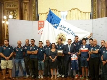 El diputado general de Bizkaia, José Luis Bilbao, ha recibido en el Palacio foral al club de Remo Urdaibai tras ganar el pasado domingo la Bandera de la Concha y les ha felicitado por sus éxitos esta temporada y su espíritu de superación tras la sanción por dopaje y su descalificación en la edición del pasado año de la regata donostiarra.