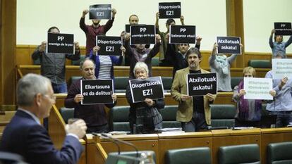 Tras el minuto de silencio que ha mantenido toda la Cámara en solidaridad con las víctimas del accidente aéreo de los Alpes franceses y cuando los parlamentarios explicaban en voto en relación con el primer punto del orden del día, los parlamentarios de la izquierda abertzale han mostrado unos carteles en contra de los detenidos y de la dispersión, momento en el que la presidenta Bakartxo Tejería les ha pedido hasta tres veces que los guarden. A la cuarta ha suspendido el pleno y los ha expulsado. Los legisladores de la izquierda abertzale han aprovechado que el portavoz del PP, Anton Danborenea estaba en la tribuna, ya que entre los carteles que han exhibido había uno que les calificaba de "enemigos de la paz".