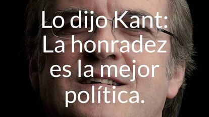 Contra las burbujas, metafísica. Al mítico cartel de Schweppes de la Gran Vía le ha salido un nuevo competidor en las últimas horas. En pleno centro de Madrid, a medio camino entre el metro y el versificado cielo de la capital, se ha colado un profesor universitario que recurre a un filósofo prusiano del siglo XVIII. "Lo dijo Kant: La honradez es la mejor política", se repite sobre distintas pantallas de Callao. A tres bandas: en la fachada y lateral de los Cines Callao, y sobre las puertas del palacio de la prensa. Para que el madrileño y el turista no escapen al mensaje del candidato socialista a la Comunidad de Madrid, Ángel Gabilondo. La campaña electoral araña sus últimas horas.