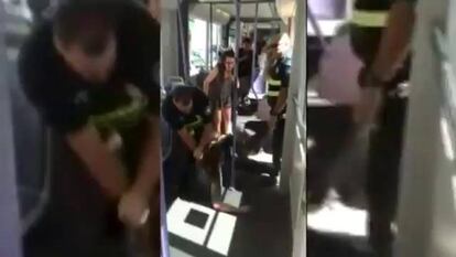 Según se puede oír en la grabación, los usuarios del tranvía gritan que el joven "no ha hecho nada" y piden a los vigilantes que lo "dejen en paz" y "suelten la porra", mientras los guardias le dicen al chico que esté quieto y no muerda.