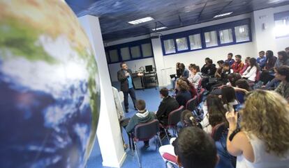 En un proyector se muestran unos gráficos inescrutables para alguien inexperto: el barrido, el tránsito y las radicaciones del telescopio. Los jóvenes siguen con facilidad la demostración de sus compañeros. Hace seis años, Alia Garcés y Sergio Duarte, de 20 y 21, ya estuvieron en contacto con la estación madrileña donde está el telescopio. Estudiaban la rotación de Júpiter por tres sedes espaciales: California (EE UU), Robledo de Chavela y Canberra (Australia).