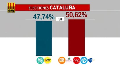 El independentismo catalán vio cumplido este domingo su objetivo de ganar claramente las elecciones en Cataluña al lograr Junts pel Sí y la CUP la mayoría absoluta del Parlamento autónomo. Pero los dos partidos no lograron rebasar el 50% de los votos, lo que puede dar alas al Gobierno para frenar el plan secesionista que ha liderado el presidente catalán, Artur Mas. Ciudadanos, segunda fuerza, destronó al PSC y al PP como principales formaciones no independentistas en Cataluña.