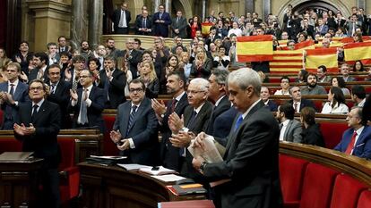 El debate parlamentario y la votación de la resolución secesionista estuvo exenta de la tensión dialéctica que cabía imaginar, a la vista de las maniobras de la semana pasada. PP y Ciudadanos acudieron, sin éxito, al Tribunal Constitucional para reclamar la suspensión de la sesión y las fuerzas independentistas forzaron la interpretación del reglamento de la Cámara para votar la resolución cuanto antes.