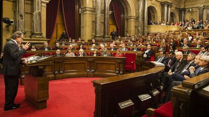 El discurso de investidura de Artur Mas quedó eclipsado ayer por la aprobación de la resolución secesionista. El presidente en funciones llegó al Parlament sin los apoyos necesarios para repetir y advirtió a los diputados de la CUP, de quien depende su investidura, de que “el proceso [de independencia] encallará” si no le dan su apoyo. Mas aseguró que tiene la “legitimidad para construir la república catalana” pese a que el secesionismo se quedó en el 47,8% de los votos el 27-S.