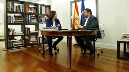 El vicepresidente de la Generalitat, Oriol Junqueras, ha lamentado que la reunión que mantuvo este jueves en Moncloa con el ministro de Hacienda, Cristóbal Montoro, y la vicepresidenta del Gobierno central, Soraya Sáenz de Santamaría, no obtuvo buenos resultados: "A efectos prácticos, nada de nada". En dos entrevistas este viernes en Catalunya Ràdio y TV3, el líder de ERC ha apuntado que el principal motivo de la reunión "es posible que sea para escenificar que dialogan y hablan con todos".