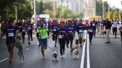 Varios miles de personas participan con sus perros en una carrera solidaria por el centro de Madrid