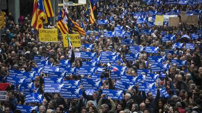 Con la mirada puesta al Mediterráneo, decenas de miles de voces clamaron ayer en Barcelona por un cambio en las políticas de fronteras y de refugio de la UE. Bajo el lema Queremos acoger, una marea de personas —160.000 personas, según la Guardia Urbana— recorrió el centro de la ciudad hasta la playa del Somorrostro, en el barrio de la Barceloneta, para exigir al Gobierno que “cumpla los compromisos de acogida” de refugiados. Según el acuerdo adoptado hace un año y medio por los países miembros de la UE, España debería haber acogido a 17.000 personas, pero sólo ha aceptado a poco más de 700. En Cataluña, en concreto, sólo se ha cubierto un tercio de las 1.250 plazas para acoger refugiados.