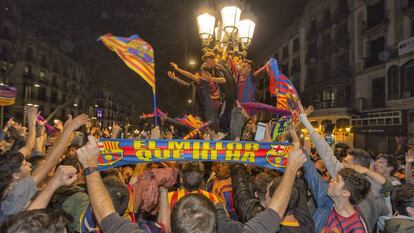 “El 4-0 fue demoledor y, después, la despedida de Luis Enrique nos hundió. Esta victoria es justo lo que necesitábamos en este momento”, gritaba Luis, un aficionado, mientras se dirigía por la calle Pelai y a buen paso hacia el epicentro de celebración de la hinchada culer. Mientras, colgados de las farolas de la fuente, media docena de personas iban marcando el ritmo de las proclamas que coreaban los asistentes.