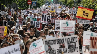 A las cinco de la tarde, hora torera por excelencia, antitaurinos de toda España desfilaban por el coso de la reivindicación en el que se ha convertido este sábado el centro de Madrid. Sin capotes ni muletillas, bajo un sol de justicia, una marea humana clamaba contra el maltrato animal. Pedían el fin de la tauromaquia en la Puerta del Sol, a menos de cuatro kilómetros de la plaza de Las Ventas, donde hace tres días comenzaron las corridas de toros de San Isidro. La manifestación ha sido organizada por 17 colectivos animalistas bajo el lema Tauromaquia es violencia.