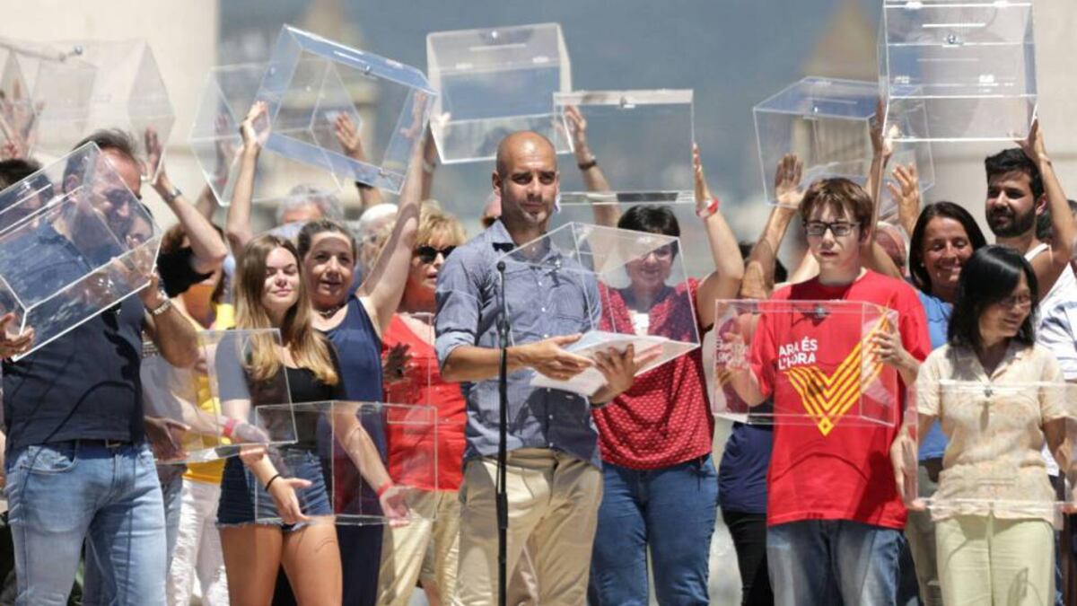 Dos días después de que Carles Puigdemont anunciase la fecha y la pregunta del referéndum de independencia, las entidades soberanistas elevaron este domingo el tono, en un acto que ha reunido a miles de personas, y han exigido al presidente catalán que no negocie con Mariano Rajoy en el tiempo que queda hasta el 1 de octubre. Los convocantes aseguraron que la consulta se celebrará “aunque el Estado no lo quiera”, según reza en el manifiesto que leyó el entrenador del Manchester City, Pep Guardiola, “La única respuesta posible es votar”, dijo.