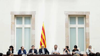 Jordi Turull y Marta Rovira, ponentes de la ley de referéndum. Habla primero Jordi Turull, diputado de Junts pel Sí: "El 1 de octubre votaremos y lo haremos con todas las garantías. Con dos novedades: trabajaremos para tener más garantías democráticas que nunca y más rigor. La base es la ley". Marta Rovira (ERC) dice que la ley se ampara en el derecho internacional.