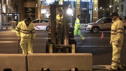 La colocación de las New Jersey que ha adquirido el Ayuntamiento es mucho más lenta. Es necesario que una grúa de grandes dimensiones coloque una a una cada pieza. Como esa operación no se puede realizar durante el día dado el elevado tráfico que registra la Gran Vía, los responsables municipales han optado por instalarlas durante cuatro madrugadas consecutivas. Sólo así se garantiza que estén listas para las cinco de la tarde del viernes, que es cuando empiezan las restricciones navideñas en esta calle.