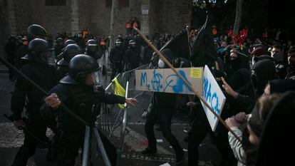 Una chica muy joven que grababa todo con su teléfono móvil dijo, a propósito del supuesto infiltrado: “Estamos todos muy paranoicos. Ese chico no parece infiltrado, no creo que lo sea. Pero nos quieren sabotear, quieren que parezcamos violentos cuando lo único que hacemos es protestar pacíficamente”. ¿Los encapuchados del contenedor no son infiltrados? En las redes se les acusa de serlo. “No, mira”, interrumpió un chico, “somos dos millones de personas, hay gente que tiene otra opinión sobre cómo hacer las cosas y contra esos también luchamos. Pero el Gobierno está encantado con ellos, ¡les están haciendo el juego!”. En ese momento se escucharon más gritos frente al edificio Colón, a 50 metros del cordón de protección de los Mossos. Hubo carreras de manifestantes, periodistas y curiosos en la zona; allí varias personas, algunas encapuchadas y otras a rostro descubierto, estaban tirando piedras, pintura, bolsas de basura y botellas de plástico de agua a los agentes. El megáfono de los Mossos comenzó a advertir: si no desistían de su actitud, “actuación policial inminente”.