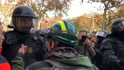 Mientras el cordón policial iba avanzando, el antidisturbios de los Mossos pide al manifestante que se interponía en su camino, un agentes rural vestido de uniforme, que si es funcionario como él le defienda, en vez de poner obstáculos a su labor.