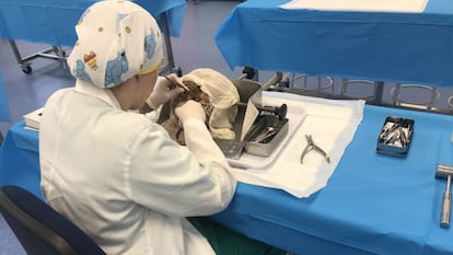 Medio millar de alumnos puede estudiar los cuerpos donados a la ciencia al mismo tiempo. Bárbara Castillo, de 25 años, lleva puestas unas gafas de aumento. Sobre la mesa, sujeta por tres grandes tornillos, yace la cabeza de un cadáver. Residente del Gregorio Marañón en el área de otorrinolaringología, pasa de nueve a seis de la tarde llevando a la práctica sus clases de anatomía. Podría ser una de las alumnas del doctor Tulp, inmortalizado en el cuadro de Rembrandt.