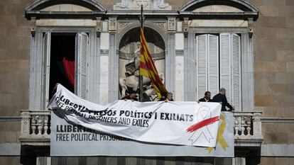 El presidente catalán, que advirtió de que defenderá “hasta las últimas consecuencias” la libertad de expresión, decidió este jueves por la mañana sustituir la pancarta del Palau de la Generalitat y remitió una copia a todos los departamentos. Pero no todos los consejeros optaron por colgarla. Por la tarde, al menos dos departamentos en manos de consejeros de Esquerra Republicana —Justicia y Agricultura— no lucían la nueva insignia. En sus edificios solo había los adhesivos y carteles colocados por grupos de funcionarios.
