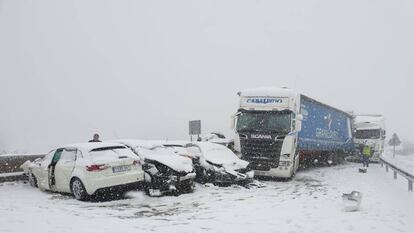 El siniestro ha tenido lugar mientras nevaba, por causas que ahora investiga la Guardia Civil de Tráfico, sobre las 14.12 de este viernes en el kilómetro 95 en la autovía de Burgos. La circulación estuvo cortada primero en sentido Burgos y después en ambos sentidos. Tras el incidente, Tráfico recomendó evitar la A-1 y, en caso de desplazarse hacia el norte, utilizar la A-6. [Consulta el estado de las carreteras | El tiempo]