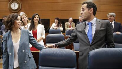Ignacio Aguado y Rocío Monasterio, los portavoces de Cs y Vox, no aplaudieron. Al contrario, los socios de Díaz Ayuso asistieron a su exposición sin mostrar ningún entusiasmo. El primer gobierno de coalición de la historia de Madrid, formado por la formación conservadora y la naranja, dependerá para todo de la extrema derecha, que permanecerá en la oposición. Y ese peaje se cobrará caro. Vox exigió este martes que la candidata explicite hoy un mayor compromiso con su programa, porque no está dispuesto a que la hoja de ruta de la legislatura se base únicamente en el programa de corte liberal que firmaron PP y Cs.