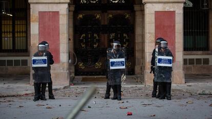 Dirigida por Xavi Pastor, experto en mediación, los antidisturbios de los Mossos buscan anticiparse al conflicto y resolverlo con el mínimo uso de la fuerza. La teoría es que, cuanto más se evite el contacto directo con los manifestantes, menos probable es que alguien resulte herido. En protestas estáticas que se prolongan horas, la tensión puede explotar en cualquier momento. Para esas situaciones, los Mossos disponen de un nuevo tipo de valla —distinta de las tradicionales de metal, que acaban empleándose como “herramienta arrojadiza” contra la policía— que evita el “acometimiento”, explican fuentes policiales. Las vallas miden 1,50 metros de altura y disuaden de un choque con la línea policial. Una empresa puede instalarlas “en menos de 24 horas” allí donde lo soliciten los mandos de policía.