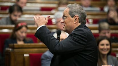 El Gobierno catalán tiene una nueva expresión tabú: desobediencia institucional. Después de que la mayoría secesionista abriera la puerta a esta opción en el Parlament, hace dos semanas, el president Quim Torra la excluyó este martes de su discurso en la sesión de control en el Parlament. La Generalitat insiste día tras día en que se ha de responder a la sentencia del juicio al procés y Torra sí apoyó este martes la vía de la desobediencia civil. Pero en la calle, no en las instituciones. Con todo, insistió en que será el Parlament el que decida la eventual respuesta institucional al fallo del Supremo.