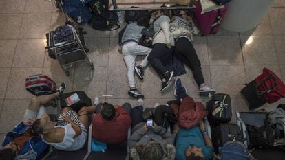 Sobre unos cartones, acomodados en una esquina tranquila de la Terminal 1 del aeropuerto de El Prat, Josephine y Filippo Musarella han pasado la noche. Llegaron ayer a Barcelona procedentes de Alicante y tenían que coger un vuelo a Niza a media tarde. Pero se canceló. "Hemos pasado la noche como hemos podido. Dormimos ahí, en esos cartones. Ahora nos dicen que nos dan plaza en un vuelo por la tarde. A ver si es verdad", lamenta Josephine. Su viaje fue uno de los 110 trayectos que se anularon en El Prat a causa del colapso que produjo en la terminal la protesta multitudinaria contra la sentencia condenatoria a los líderes independentistas encarcelados. Este martes se han anulado 45, de un total de un millar, como consecuencia de la operativa que no se pudo realizar ayer.