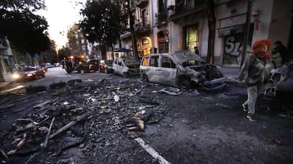 Contenedores y coches en llamas fueron lo más vistoso. Pero también ardieron parquímetros, maceteros de bares, motos, árboles, banderolas publicitarias, tiestos en balcones…. y el calor reventó el cristal de una portería y fundió carteles de comercios. A esta descripción del panorama en la zona cero de los disturbios de la noche del miércoles en Barcelona, la calle de Roger de Flor entre Diputació y Consell de Cent, faltaría añadir un tremendo olor a basura y a plástico quemados. Y, para hacerse a la idea del mal rato que pasaron los vecinos, hay que pensar que ocurrió a solo 30 metros, ¡30!, de una gasolinera.