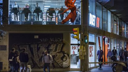 Un poco más abajo, casi en el barrio del Camp de l’Arpa, en una esquina hay un enorme contenedor lleno de escombros. Y solo a quien escribe estas líneas se le ocurre pensar que igual sería una temeridad que estuviera en el centro, donde el viernes los disturbios acabaron a pedradas contra la policía. En las calles de Pare Claret e Industria, dos vías paralelas por las que pasan una docena de líneas de bus, las marquesinas están llenas en la hora punta de la tarde. Y los vecinos se paran ante las obras de un local, donde se trasladará una exitosa carnicería ubicada ante la parroquia de la calle de Sant Quintí. “Ya casi acabáis”, les gritan los clientes desde la calle.