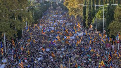 Decenas de miles de personas han reiterado este sábado en Barcelona, tras dos semanas de protestas, su rechazo a la condena a los líderes del procés. La Assemblea Nacional Catalana (ANC) y Òmnium Cultural han reunido a un centenar de entidades y a 350.000 personas, según la Guardia Urbana. En un contexto de división entre los partidos separatistas, que han dejado que el pulso se libre en la calle, los organizadores han celebrado que se mantenga “la movilización permanente”, pese a ser la cifra más baja de asistentes a las grandes marchas soberanistas en los últimos ocho años.