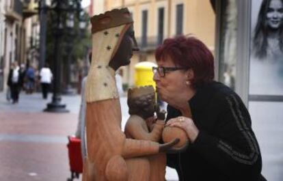 Este jueves, tres operarios bajaban la Virgen a hombros desde el último piso del edificio bajo la atenta mirada de los vecinos. “No ha sido difícil, pero la figura pesaba bastante”, dice Pepe Berenguer, representante de fincas Llaberia Puigbò, que constataba la expectación que habían generado los trabajos. Después de sacar la Virgen de la vitrina, la figura estuvo un rato expuesta en medio de la calle provocando que algunas personas se acercaran a tocarla, besarla e, incluso, santiguarse.