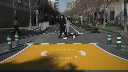 El gobierno de los comunes y el PSC se ha marcado como objetivo de este mandato pacificar el entorno de 200 escuelas de primaria hasta 2023, un tercio de los centros de la ciudad. El objetivo de este 2020 es llegar a 20 escuelas. Y se ha empezado por Grèvol, una cooperativa del distrito de Sant Martí, donde hace unos meses murió un alumno atropellado. La pacificación ha consistido en eliminar dos carriles de circulación, ahora destinados un gran espacio de estancia, con bancos y zonas de juego, que ocupa toda la fachada del centro y se prolonga a lado y lado con aparcamientos para bicicletas.