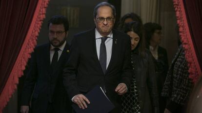 Tanto JxCat como ERC defienden —basándose en un informe de los letrados de la Cámara catalana— que, pase lo que pase, Torra seguirá siendo presidente, pese a que el reglamento de la Cámara indica que solo puede serlo un diputado. Ambos partidos han defendido este fin de semana la necesidad de aguantar la legislatura al menos hasta que se aprueben los presupuestos autonómicos. “Sería un colapso afrontar el 2020 con los presupuestos prorrogados de 2017”, dijo el sábado el vicepresidente Pere Aragonès, artífice del acuerdo entre el Govern y Catalunya en Comú Podem para presentar un proyecto de presupuestos que debería aprobarse antes de la primavera.