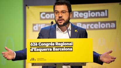 El vicepresidente de la Generalitat, Pere Aragonès, interviene en el congreso de la federación de Barcelona de ERC. En vídeo, el independentismo se distancia en precampaña.Foto: atlas | Vídeo: DAVID ZORRAKINO (EUROPA PRESS) / atlas