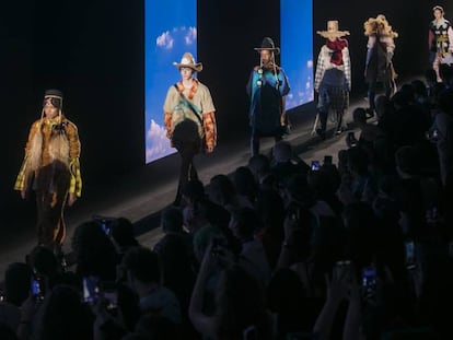 La presentó hace unos días en París, pero Alled-Martinez acudió ayer a la pasarela de su ciudad para enseñar su trabajo. Su última colección, inspirada en los setenta, viste a los dandis que no pretenden serlo, con trajes de tejido vaquero, chalecos sin camisa o monos desabrochados. Con una paleta de blanco, negro, azul y rojo, sus modelos acabaron sentados, copa en mano, en butacas de escay, o de pie en la sala, como si estuvieran en una fiesta.