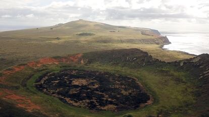 Lo que esconden las profundidades del volcán Rano Raraku es, como suelen ser las cosas en la isla de Pascua, un misterio. Sin embargo, la crisis climática ha permitido revelar parte de él. La falta de lluvias durante los últimos años secó el humedal que albergaba el cráter volcánico, y un feroz incendio arrasó con los juncos de totoras que se asomaban desde el fondo, dejando ver un moái de 1,60 metros de alto y 90 centímetros de ancho hasta ahora desconocido por la comunidad rapanui. También aparecieron otros artefactos y trozos de piedra que podrían pertenecer a otra majestuosa escultura. “Nunca pensamos que podíamos encontrar estos hallazgos arqueológicos en este lugar”, sostiene por teléfono Salvador Atan Hito, vicepresidente de la comunidad indígena Ma´u Henua, administradora del Parque Nacional Rapa Nui.