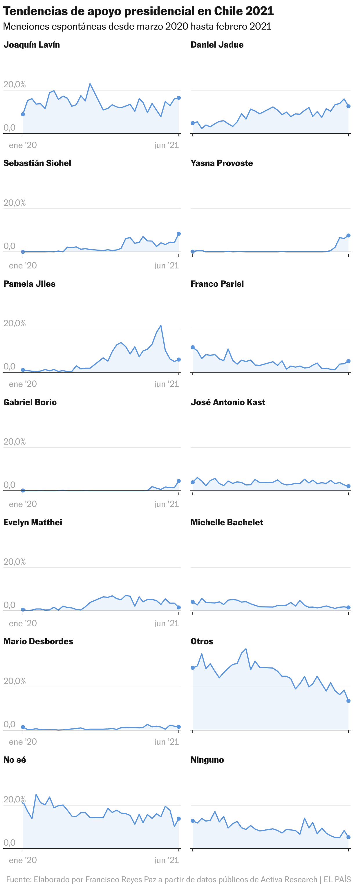 En marzo de 2021, aproximadamente a 8 meses de la segunda vuelta, las encuestas mostraban una historia distinta a lo que sería el resultado final. Durante la segunda quincena de marzo, las encuestas, mostraban al entonces alcalde de Las Condes, Joaquín Lavín, rondando el 14% de apoyo, seguido de cerca por la diputada Pamela Jiles con 13%, y más atrás el alcalde Daniel Jadue de Recoleta con 7,5%. En contraste, quienes terminarían disputando la presidencia en segunda vuelta —José Antonio Kast y Gabriel Boric— apenas registraban apoyo en estos sondeos tempranos, sin que ninguno de ellos superara el 4% de las menciones espontáneas. En este proceso, Lavín y Jadue serían derrotados en primarias de sus coaliciones, mientras que Jiles nunca concretó una candidatura viable.