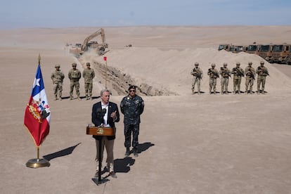 “Queremos usar las retroexcavadoras para construir un Chile soberano (…) que ha sido vulnerado por la inmigración ilegal, por el narcotráfico, por el crimen organizado”, dijo Kast cerca de la frontera peruana el 16 de marzo —apenas cinco días después de instalarse en el palacio de La Moneda— con el puntapié inicial de la construcción de la zanja que, con vallas, drones y mayor presencia policial y militar, busca poner en marcha lo que ha llamado el “Plan Escudo Fronterizo”. El fin de semana, el ministro de Obras Públicas, Martín Arrau, destacaba en el Canal 13 de televisión que “en estos 30 días hemos hecho más en este tipo de cosas [las zanjas] que lo que se ha hecho en los últimos 10 años, en términos de avance, de metros cúbicos removidos, de kilómetros lineales avanzados”.