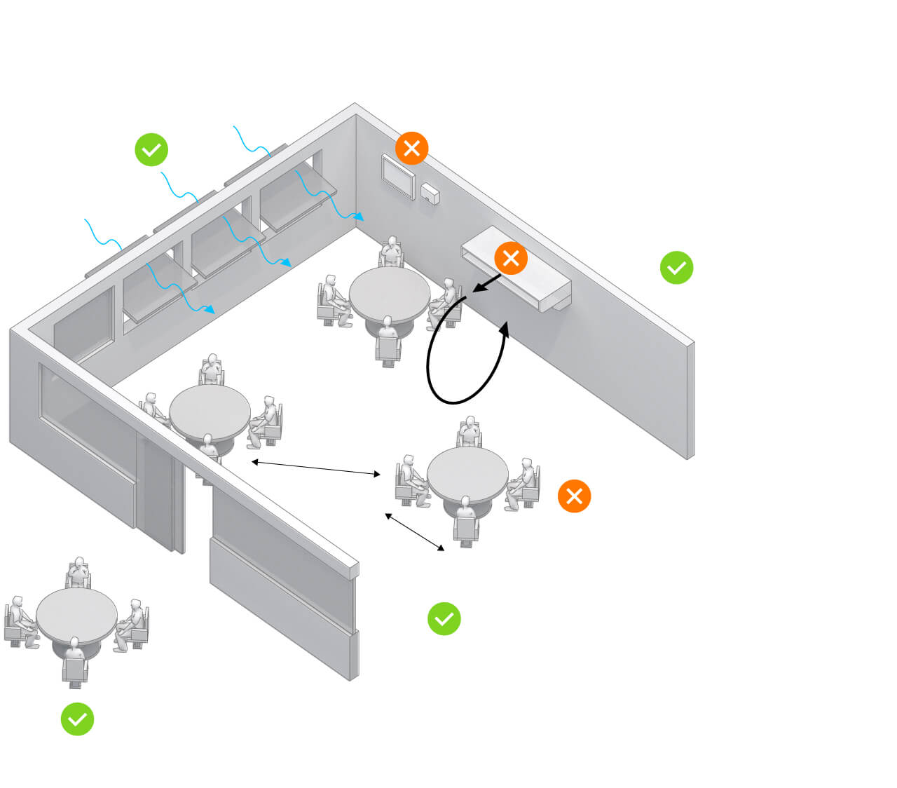 Evitar música de fondo que obligue a alzar la voz (se expulsan más gotas por la boca)