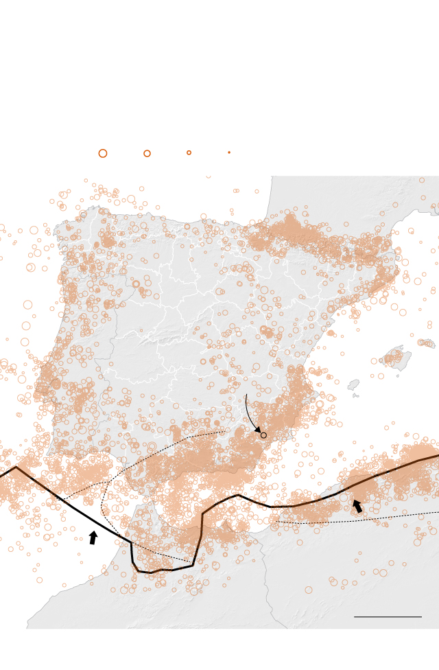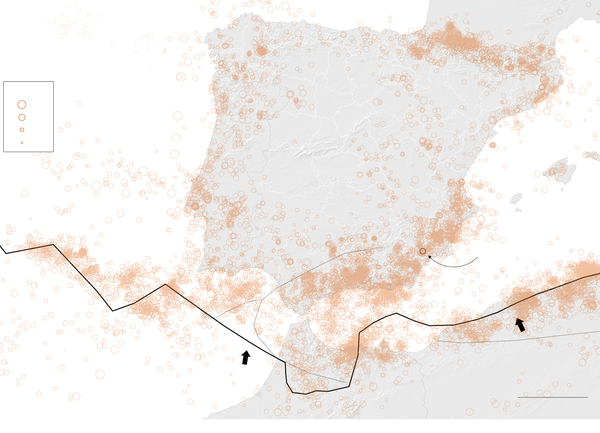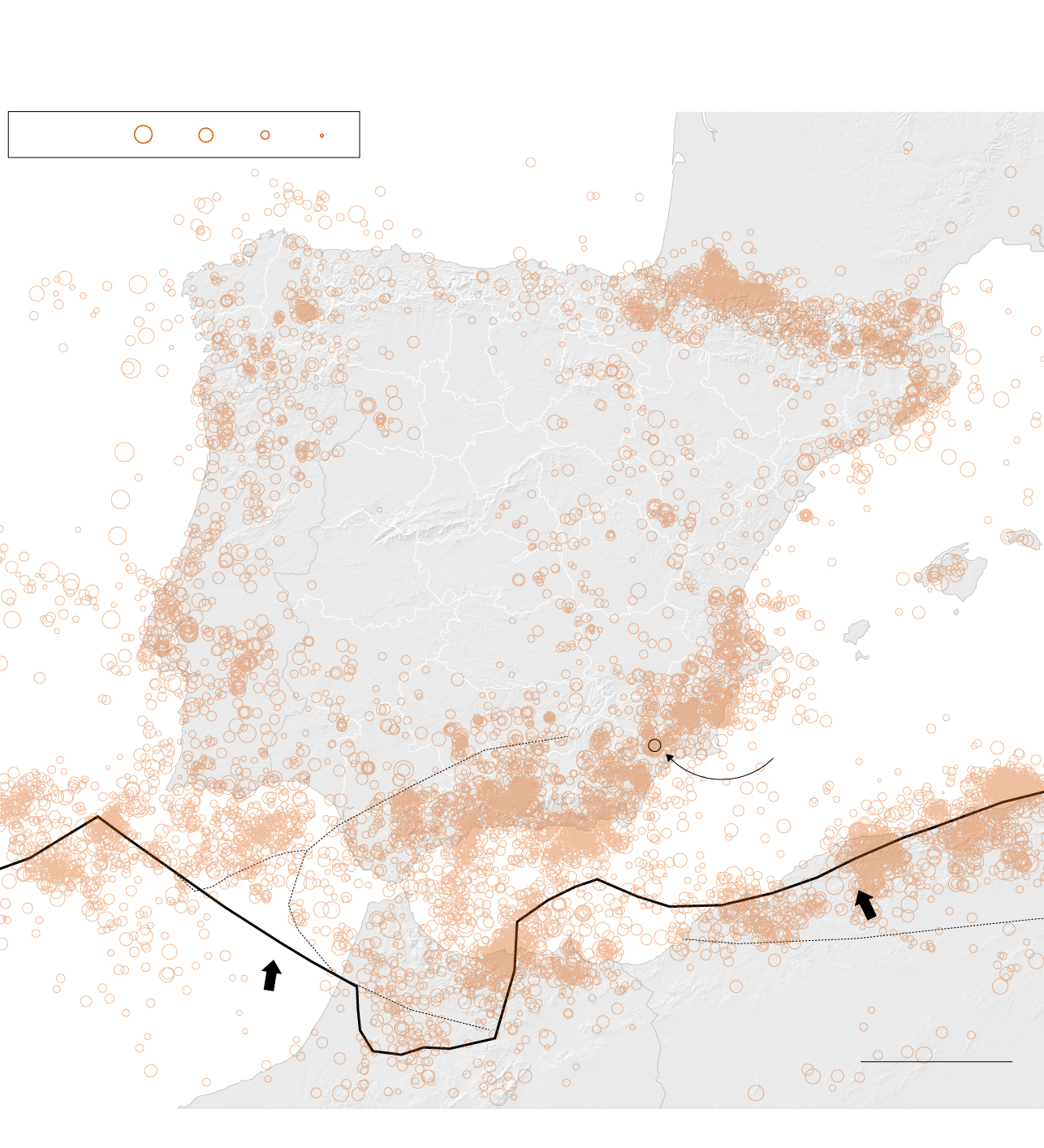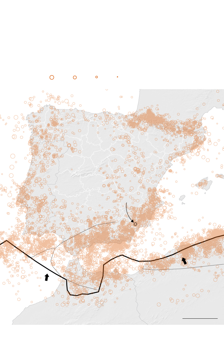 Pero ese beso geológico es solo el origen del estremecimiento de la Península. Desde el 2 de diciembre de 2020 hasta el 27 de enero del presente año, la Red Sísmica Nacional registró más de 430 terremotos de magnitudes de entre 3 y 4,5 en el área de Atarfe, junto a la capital de Granada, según el informe de los investigadores Julián García-Mayordomo y Raúl Pérez López para el Instituto Geológico y Minero de España (IGME). El movimiento de las placas (fragmentos relativamente rígidos) y la deformación de la litosfera producen un campo de esfuerzos tectónicos que repercuten en las fallas, esas fracturas de la tierra que se distribuyen por la Península; especialmente desde Lisboa a Ourense, y por todo el arco mediterráneo y en la frontera con Francia.
