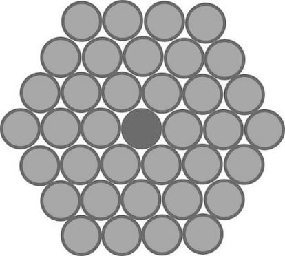 Si en un apretado haz de flechas hexagonal contamos 18 en su parte exterior, como vimos la semana pasada, podemos calcular el total de flechas a partir de un esquema como el de la figura, en el que es fácil ver que son 37. Y el esquema también muestra, contando las capas sucesivas, la secuencia de los números hexagonales centrados: 1, 7, 19, 37…, cuyo enésimo término es 3n (n – 1) + 1. ¿Qué relación podemos establecer entre los números hexagonales centrados y los números triangulares, vistos en semanas anteriores?