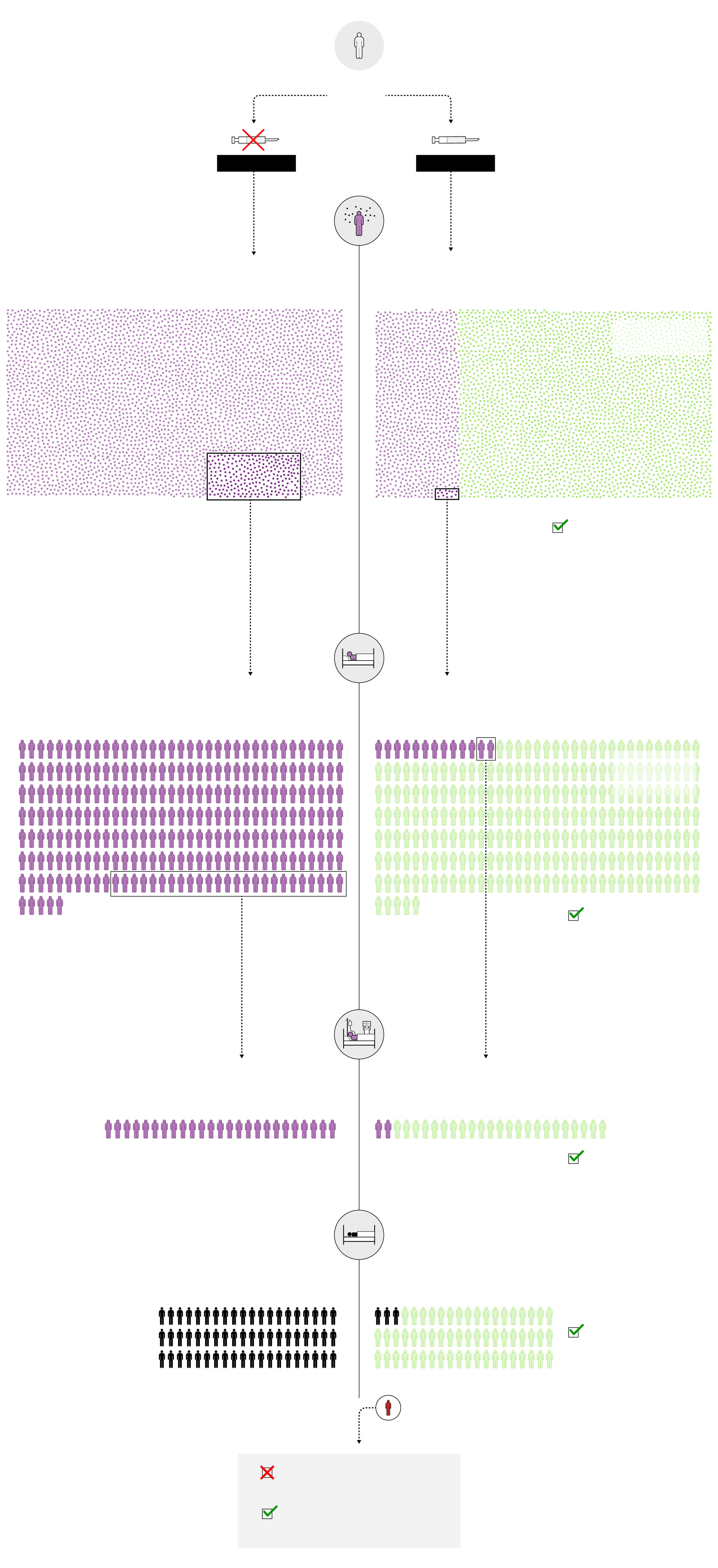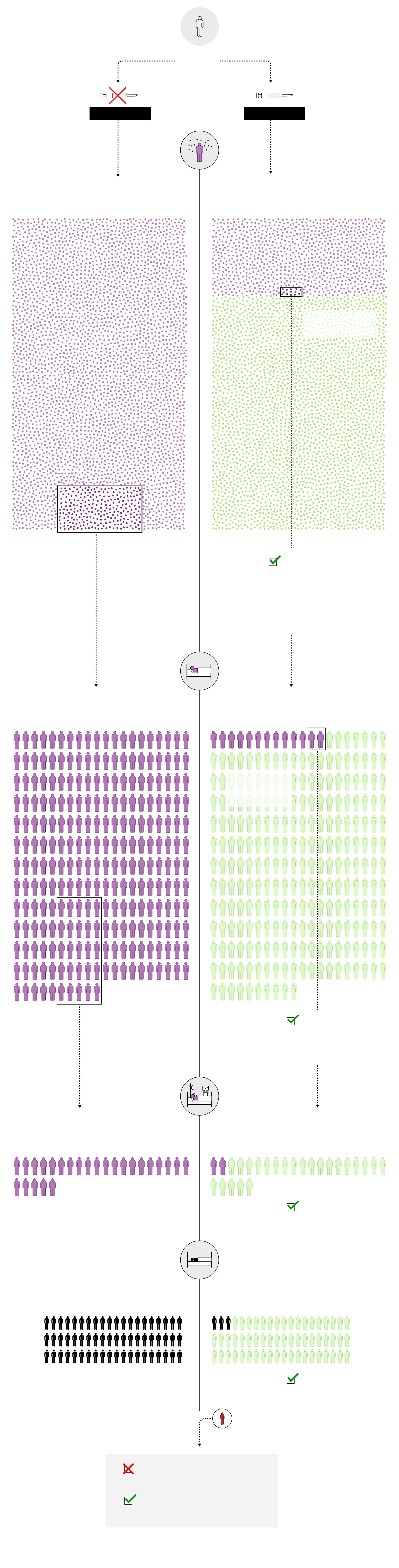 En un escenario así, las ventajas de la vacuna se multiplican. Para los mayores de 80 años, se evitan 10.000 muertes. Pero ahora el beneficio sería más claro incluso para la gente de menos edad: para un joven infectado, el riesgo de acabar en la UCI es de 40 por 100.000, mientras que el de sufrir un trombo parece ser de 2 por 100.000.