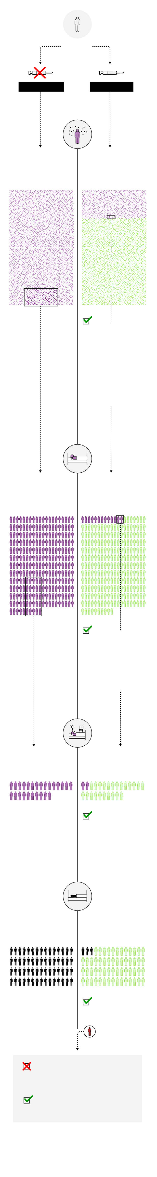 Todas las vacunas autorizadas son extremadamente eficaces a la hora de evitar los casos graves de covid, una enfermedad que ha matado a unos tres millones de personas en un año. Sin embargo, hay ciudadanos que tienen más miedo a la vacuna que al coronavirus. El foco está ahora en las inyecciones de AstraZeneca y Janssen, tras detectarse en decenas de vacunados un fenómeno muy infrecuente —alrededor de 1 en 100.000— de formación de coágulos sanguíneos potencialmente letales. A continuación mostramos unos cálculos de riesgo y beneficio, por supuesto aproximados, pero que sirven para entender el tipo de números que manejan las agencias reguladoras de los medicamentos. Empezamos con el caso general, tomando 100.000 adultos de todas las edades durante cuatro meses, con una incidencia de covid similar a la de este año en España: