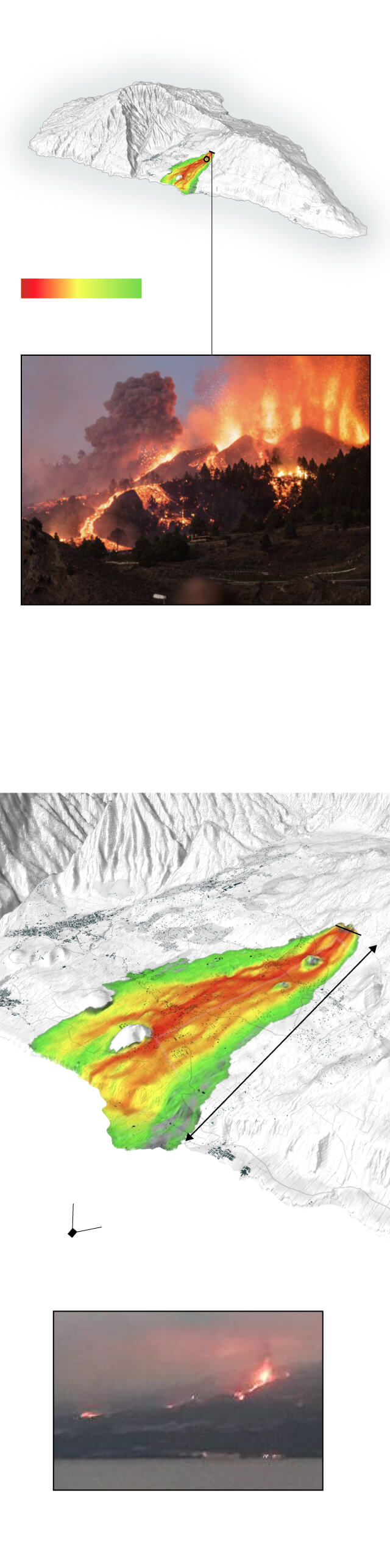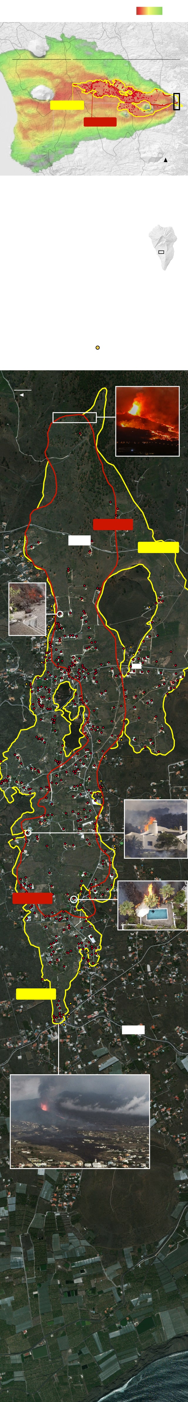 Un mapeo de emergencia de la zona realizado por el servicio europeo Copernicus detalla la superficie de 1,9 km² (191 hectáreas) quemada por la colada y los edificios destruidos total y parcialmente. Actualizado el 25 de septiembre a las 15.05 (hora peninsular española)