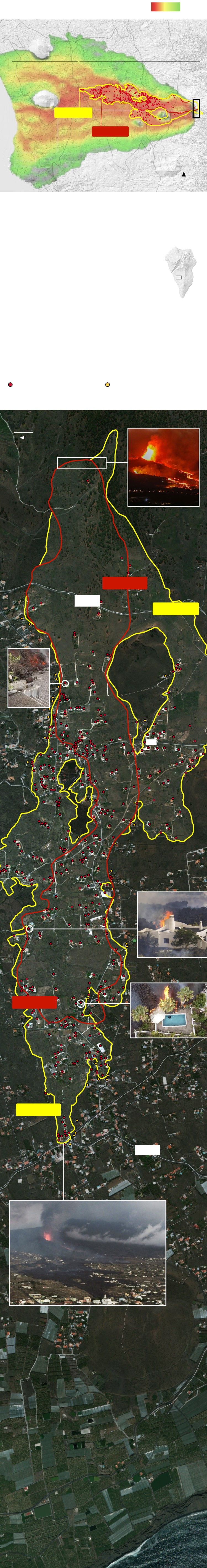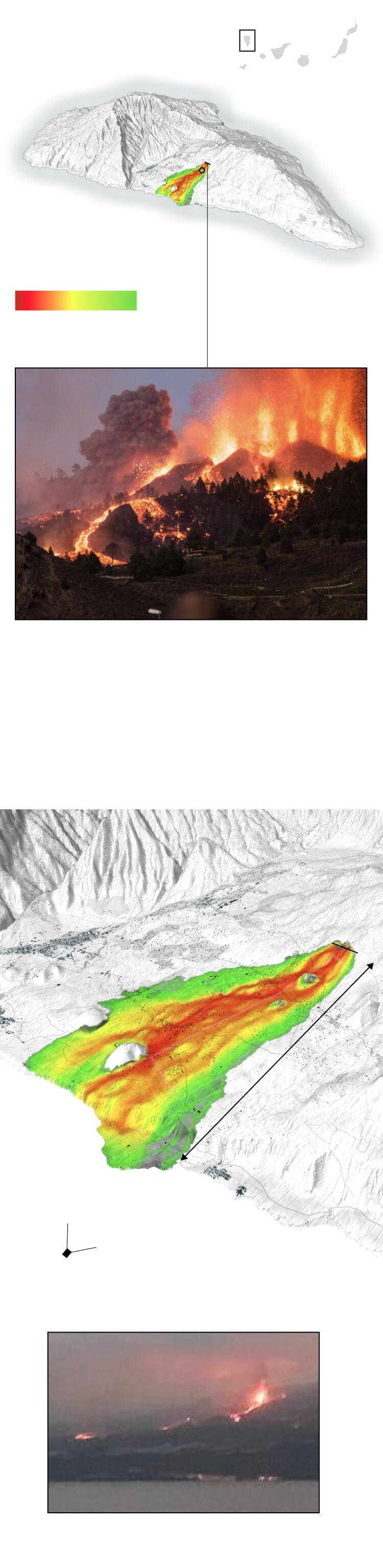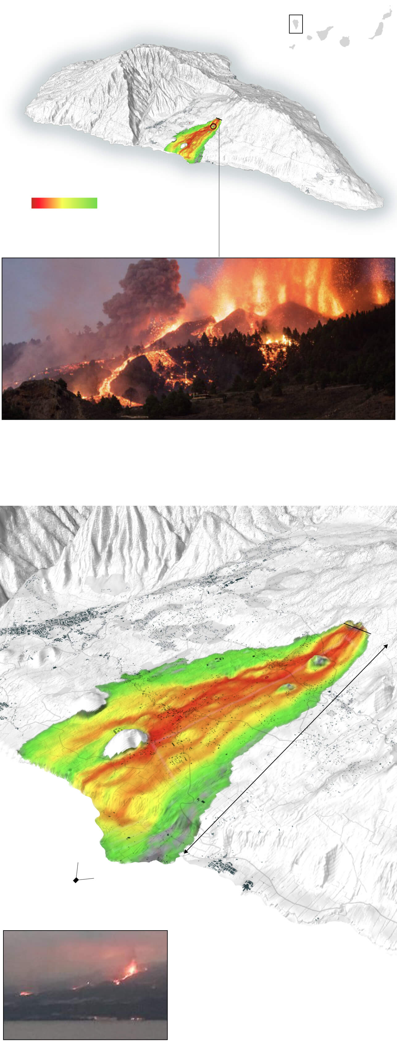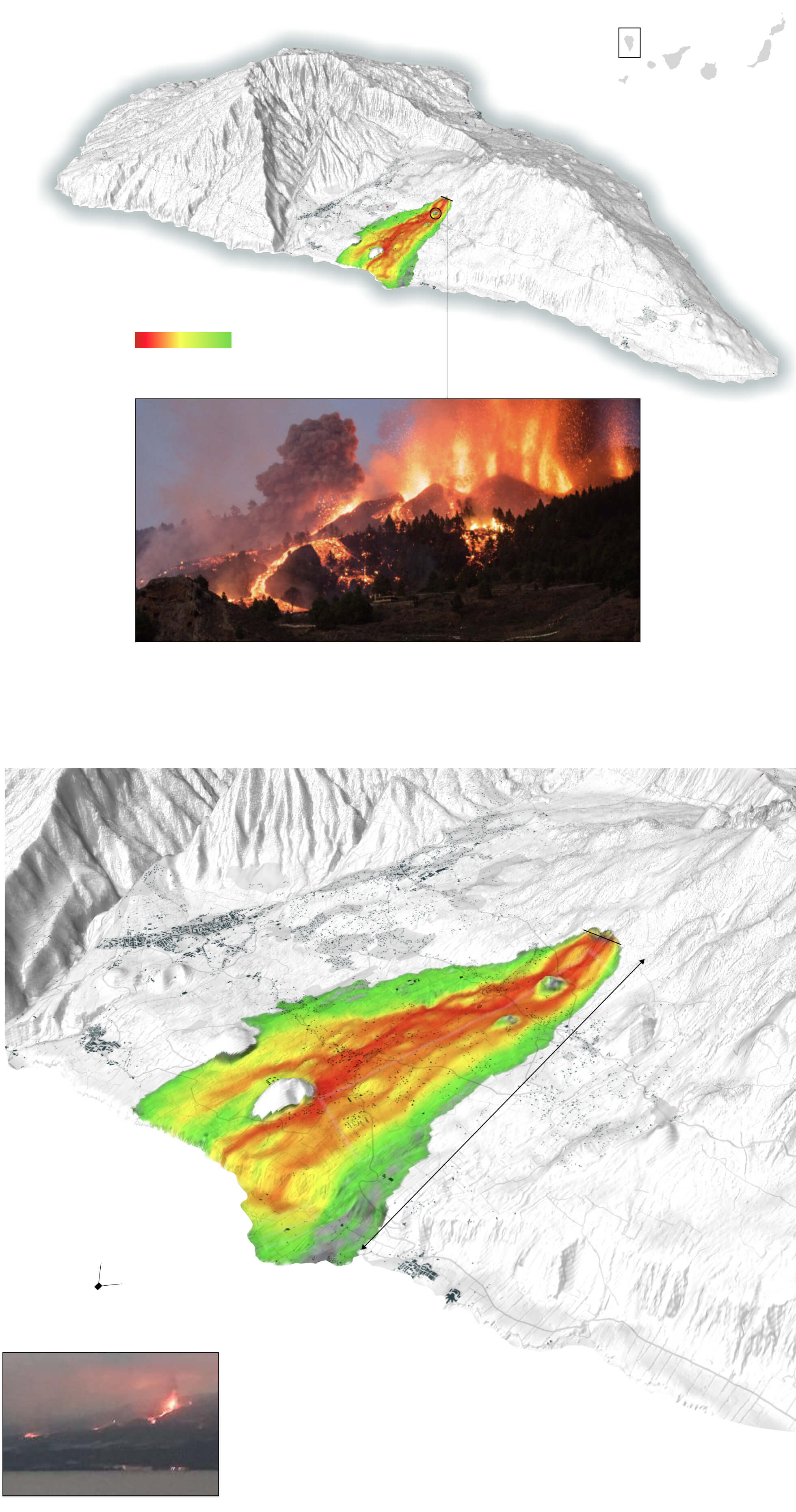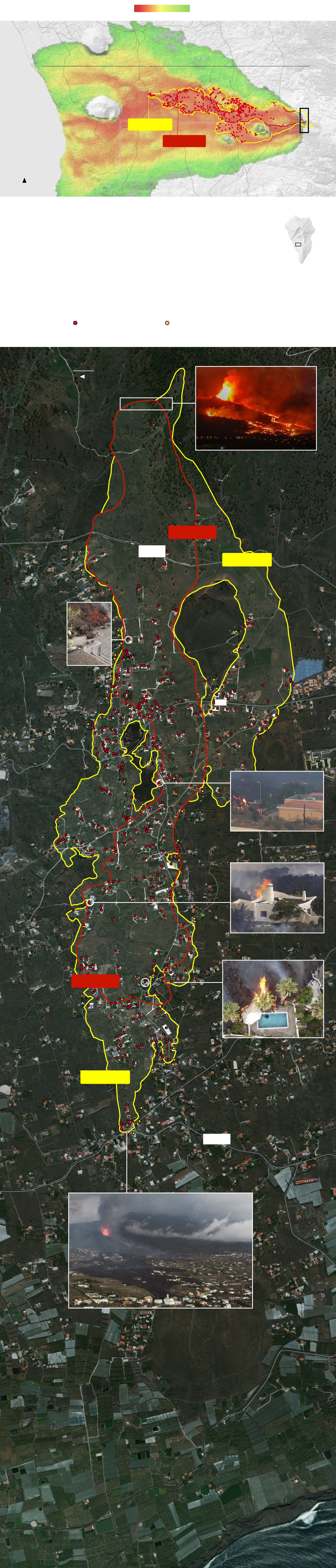 El análisis de las imágenes de los satélites europeos detalla los edificios destruidos por la colada. Los científicos calculan los caminos más probables que tomará la lengua de lava hacia el mar