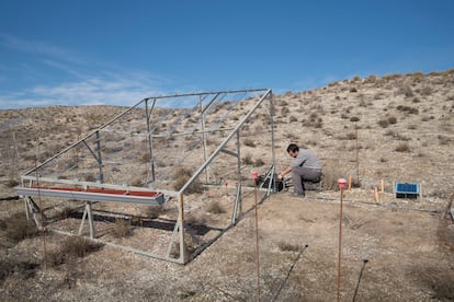 Bajo el metacrilato llueve un 45% menos de agua, pero se suponía que siendo plantas habituadas a un entorno tan extremo pasarían la prueba. “Pero manteniendo de manera consistente la sequía, lo que hemos ido observando es que se ha ido reduciendo el reclutamiento”, explica Sánchez. El ritmo anual de estos paisajes empieza en otoño, cuando germinan las semillas, florecen y reverdecen con las lluvias de primavera y se agostan en verano, quedando nuevas simientes bajo el seco amarillo para que el próximo otoño se reinicie el ciclo. “Observamos que cada vez tenemos menos, los individuos adultos van muriendo y no hay reemplazo”, concluye.