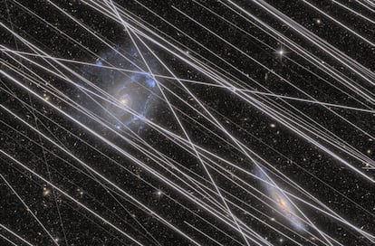 Primero llegaron unas curiosas luces en el cielo tras el anochecer, que sorprendieron a los aficionados a la astronomía; y los más entusiastas con el nuevo fenómeno, provocado por la red de satélites Starlink de Elon Musk, animaron a todos a salir a contemplar el espectáculo de los trenes luminosos que generaban estos artefactos durante su ascensión. Luego vinieron las protestas de los astrónomos, que veían cómo esas luces arruinaban las imágenes de sus telescopios atravesándolas con intensas rayas blancas; entonces, Musk prometió minimizar esos efectos —con mejoras que nunca llegó a aplicar— y animó a los científicos a no limitarse a los observatorios terrestres: tendrían que salir más al espacio. Ahora un estudio de la NASA alerta de que ni siquiera los telescopios espaciales como el Hubble podrán escapar de esa amenaza, la que las constelaciones de satélites suponen para la astronomía.